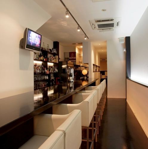 店舗に入ってすぐの大型カウンターは、お仕事帰りのお客様やデートにぴったりの空間です。カウンターにはテレビも完備しており、ゆったりとした時間をお過ごしいただけるよう配慮しております◎